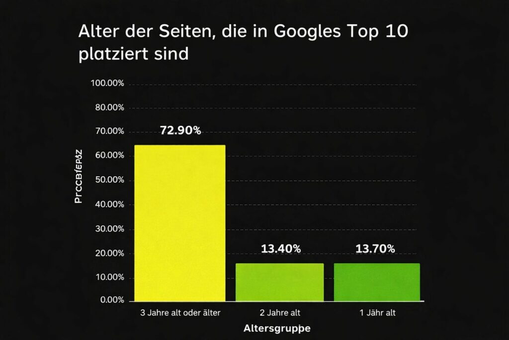 Starke Linkprofile gehen tendenziell Hand in Hand mit Top-Rankings, aber Ergebnisse brauchen Zeit. Jüngste Ahrefs-Forschung zeigt, dass nur 1,74% neu veröffentlichter Seiten innerhalb eines Jahres in die Top 10 kommen (von 5,7% in einer früheren Kohorte). Außerdem sind 72,9% der Seiten in den Top 10 älter als 3 Jahre und die durchschnittliche #1–Seite ist etwa 5 Jahre alt. (Ahrefs)