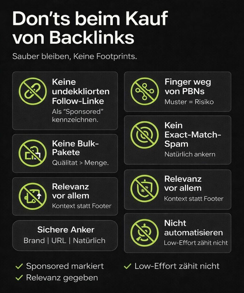 Linkkauf ist kein „Set it and forget it“. Es ist leicht, Budget zu verbrennen, Footprints zu hinterlassen und still abgewertet zu werden. Halte deinen Footprint mit diesen harten No-Gos sauber: