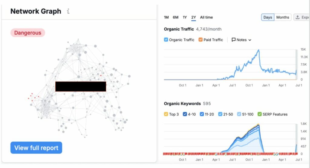 Hier siehst du ein Beispiel, wie es aussieht, wenn Semrush von einem Linkaufbau abrät. Das Linkprofil der betreffenden Seite wirkt sehr unnatürlich – und genau das erkennt Google.