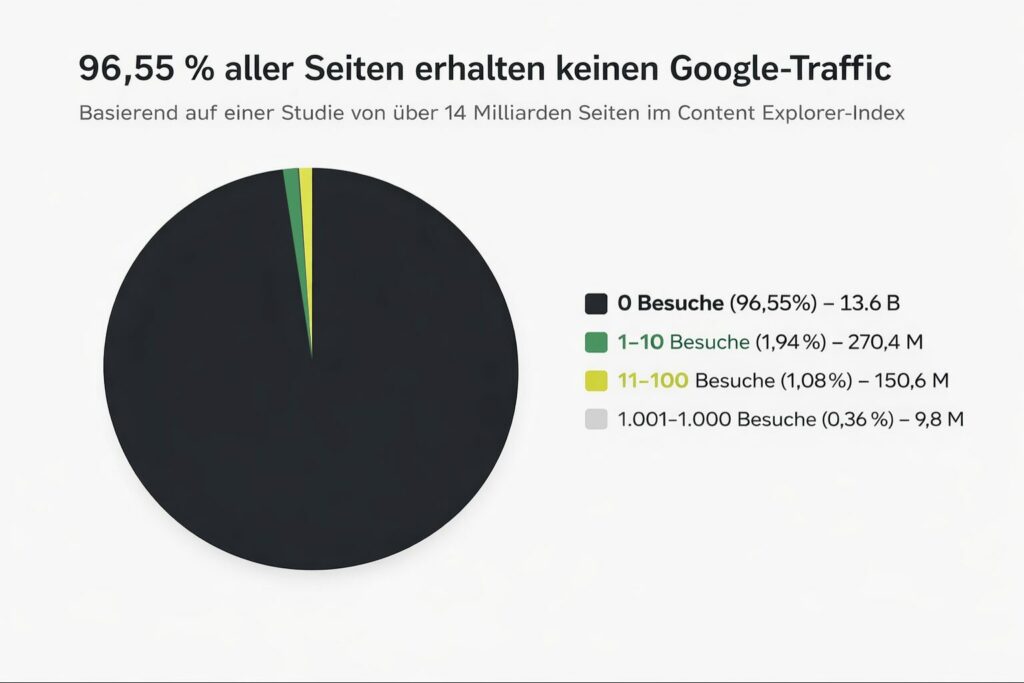 Laut Ahrefs erhalten 96,55 % aller Seiten keinen organischen Traffic von Google – oft weil sie ohne klare Themenstrategie, Suchintention oder Nachfrage erstellt wurden.(Ahrefs)