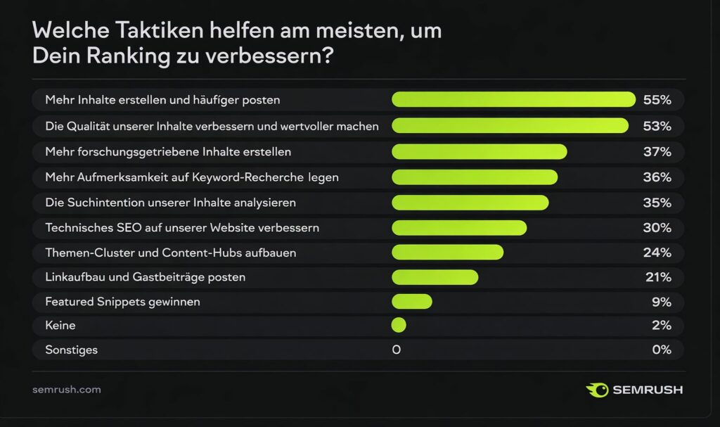 Semrush (2026) zeigt, dass Websites, die ihre Content-Strategie mindestens jährlich auffrischen, organischen Traffic 23% schneller steigern als solche, die das nicht tun. (Semrush)