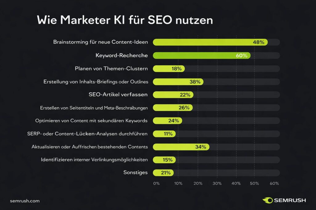 Semrush berichtet, dass 68 % der Unternehmen einen höheren ROI aus Content Marketing und SEO verzeichnen, wenn sie KI einsetzen. (Semrush)