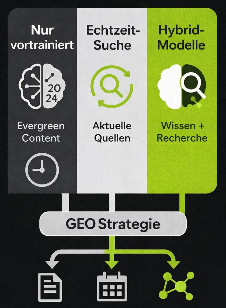 Diese Modelle erzeugen Antworten ausschließlich aus ihren Trainingsdaten vor 2024. Sie holen keine Echtzeitinfos, daher glänzt hier dein zeitloser Evergreen‑Content – wie grundlegende Leitfäden. Halte deine Fakten korrekt, denn diese Engines können keine Live‑Updates prüfen.