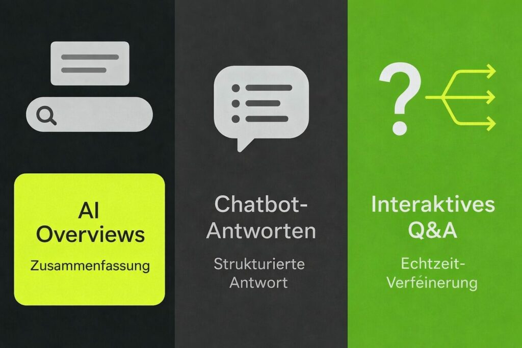 Diese verbinden Live‑Websuche mit generativen Antworten. Sie durchsuchen aktuelle Quellen, wählen die besten Schnipsel und basteln daraus eine Antwort. Zur Optimierung: