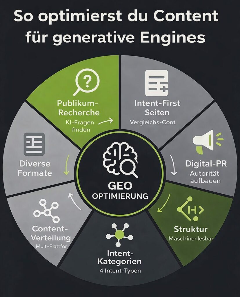 Anders als klassisches SEO verlangt GEO, dass du verschiedene KI‑Prompts bedienst. Sprich alle vier Hauptintentionen an: