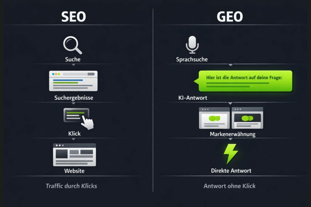 Stell dir vor, du stehst in der Küche und fragst deinen Smart Speaker: „Hey Google, was ist der Unterschied zwischen SEO und GEO?“ Sofort erhältst du eine prägnante, konversationelle Zusammenfassung aus verschiedenen Quellen – keine SERP, kein Klick.