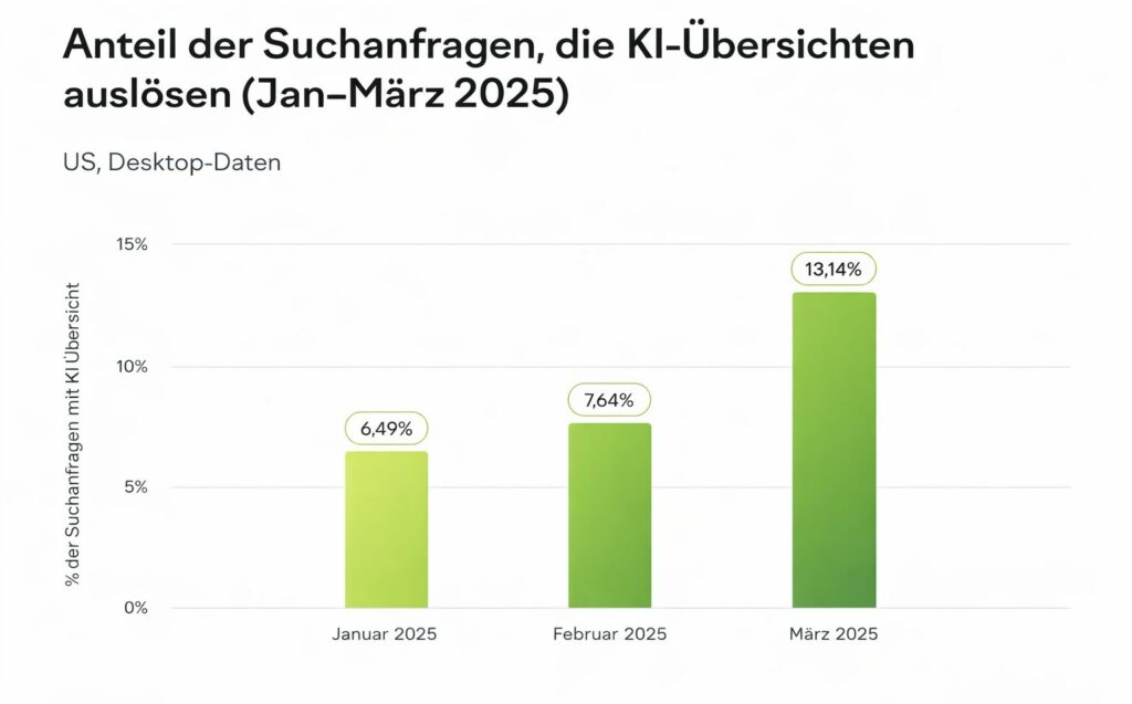 Im März 2025 erschienen AI Overviews in etwa 13.14% aller Google-Suchen, was zeigt, wie Search sich stärker in Richtung intent-driven Results verschiebt statt nur nach purem organischem Ranking. (Semrush)
