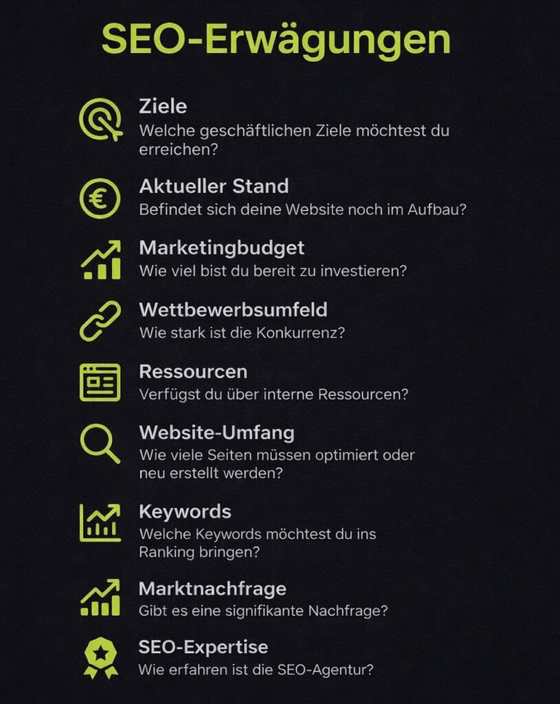 • SEO-Kosten pro Monat: dein Budget pro Monat (z. B. 2000 €).