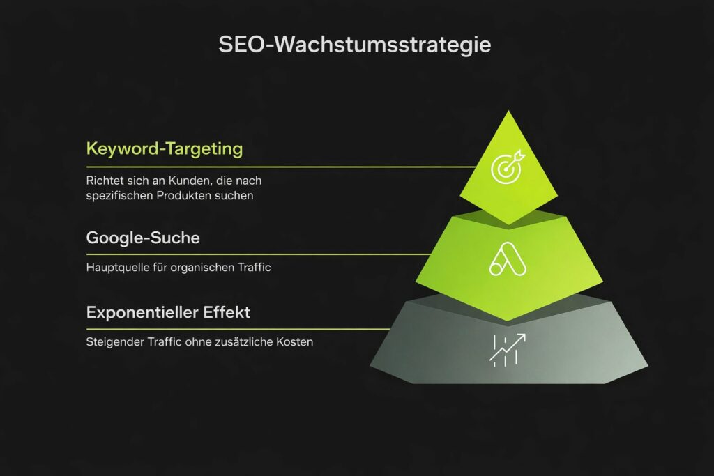 Wenn du in SEO investierst, hast du jeden Monat dieselben SEO Kosten. Mit der Zeit finden jedoch immer mehr Menschen deine Seite ganz von selbst – ohne dass du zusätzliches Budget einsetzt.
